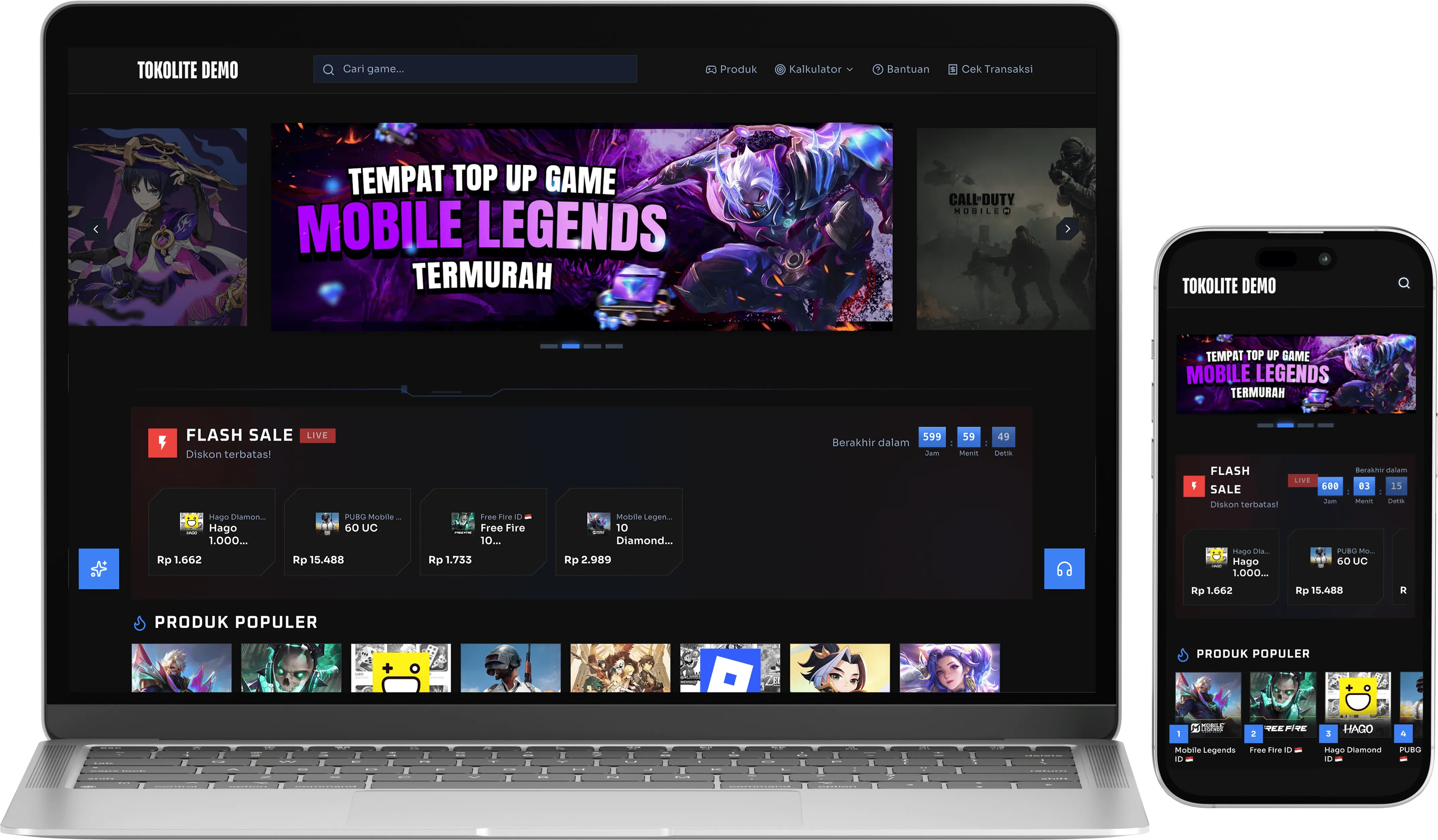 Semua paket sudah include website, sistem transaksi otomatis, dan akses ke semua produk game. Beda di fitur & domain aja.